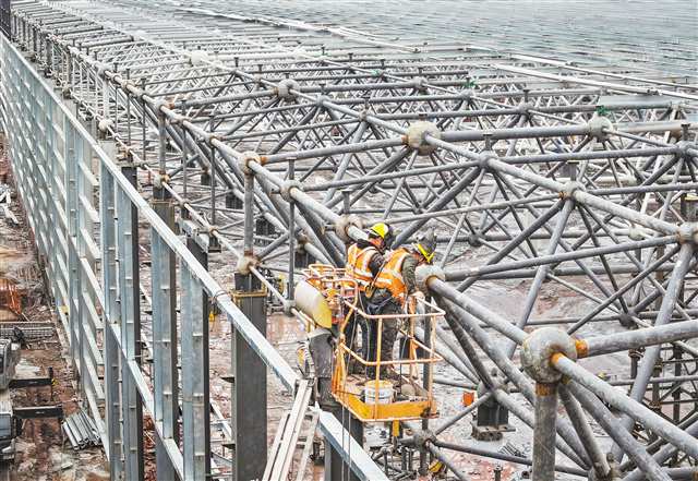 瑞航(重庆)航空发动机维修基地二期工程施工现场,工东谈主正在加紧功课。首席记者 龙帆 摄/视觉重庆