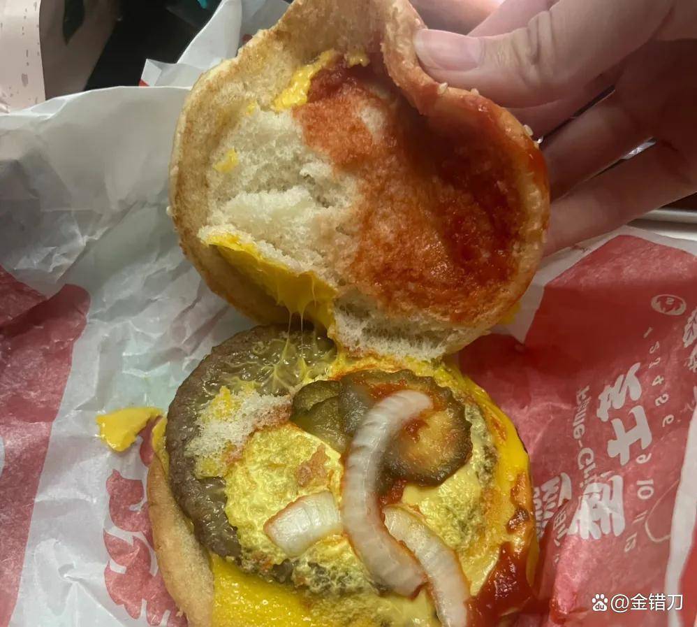 牛肉饼缩水,烤出来的肉饼干柴无味,莫得涓滴汁水;面包胚放深切发硬,生菜发黄发蔫,酸黄瓜落伍发酸,就连番茄酱,皆变得三三两两,毫无滋味。