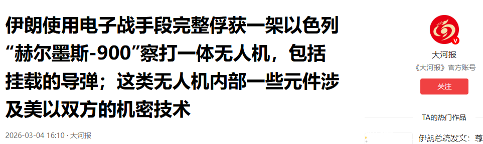 信息源流:伊朗使用电子战技巧完满俘获一架以色列“赫尔墨斯-900”察打一体无东谈主机,包括挂载的导弹;这类无东谈主机里面一些元件波及好意思以双方的奥秘工夫