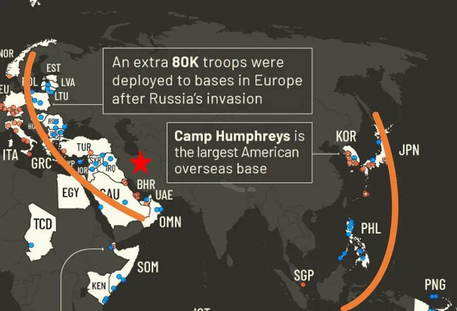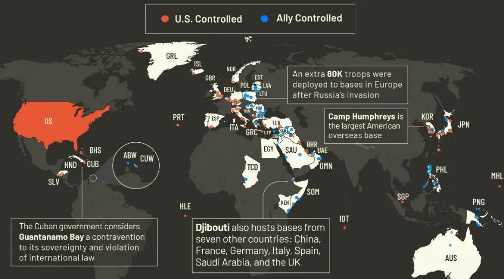 图中白色区域为领有好意思军基地部署的国度或地区。